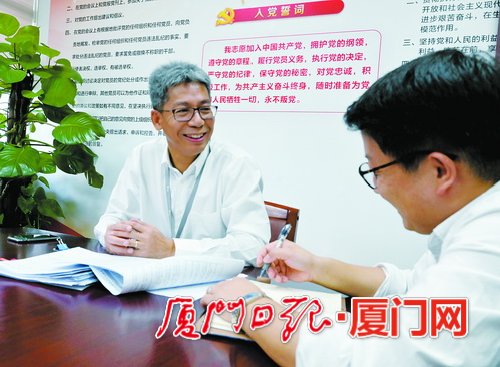 象嶼股份黨委副書記、副總經(jīng)理齊衛(wèi)東(左)跟員工探討項目落實情況。(《廈門日報》記者 黃曉珍 攝)