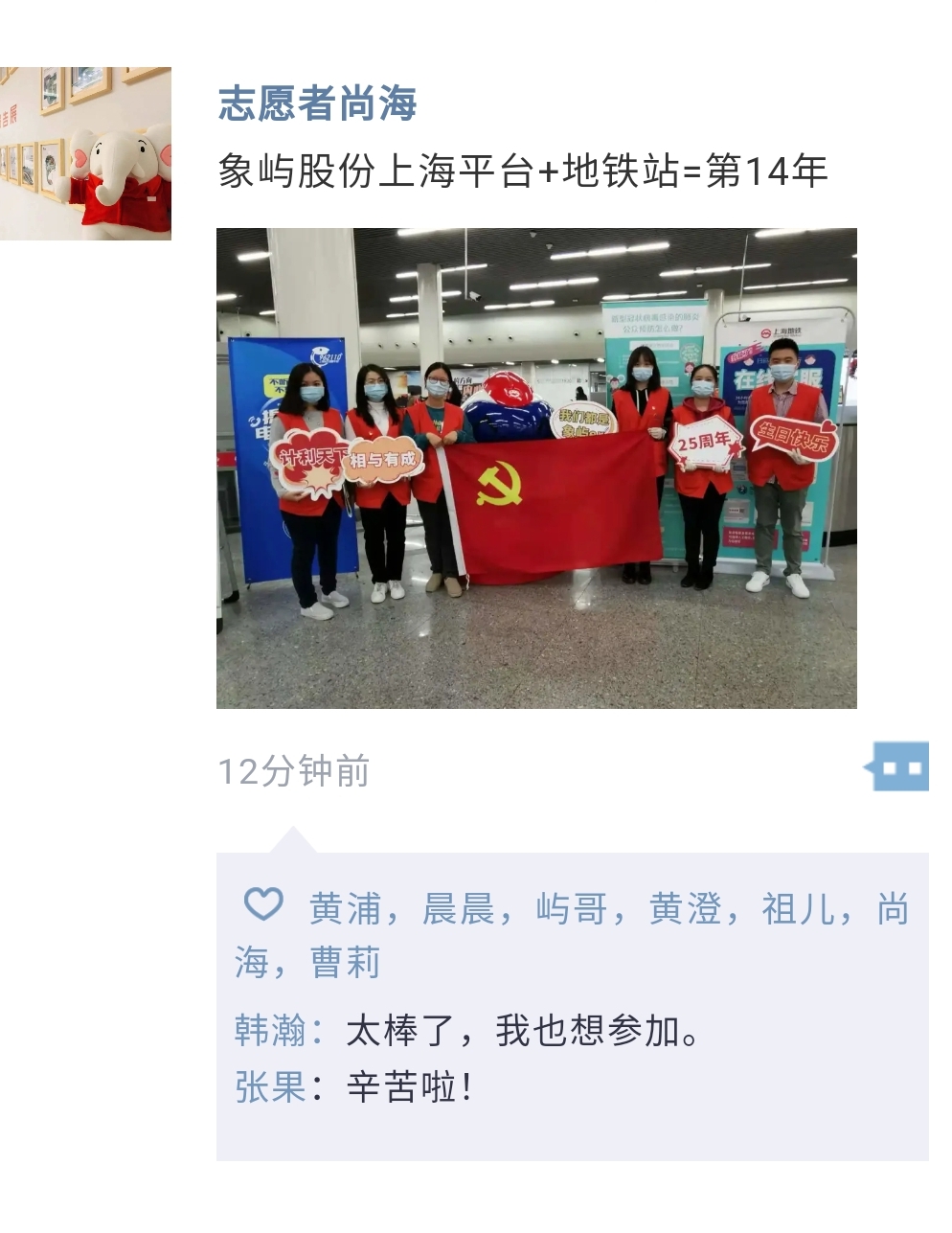 這是象嶼股份上海平臺(tái)志愿者走進(jìn)地鐵站的第14個(gè)年頭。作為城市文明的先行者和宣傳者,志愿者們十四年如一日,堅(jiān)持用真誠(chéng)主動(dòng)的服務(wù)為出行的乘客送上溫暖,讓“象嶼紅”成為地鐵站里一道亮麗的風(fēng)景線。